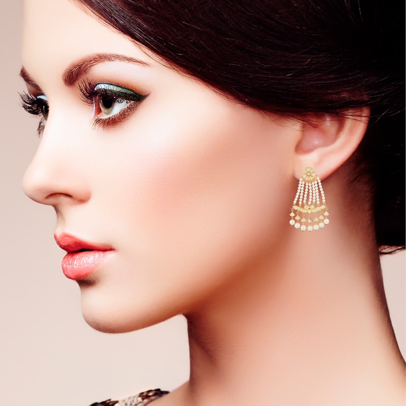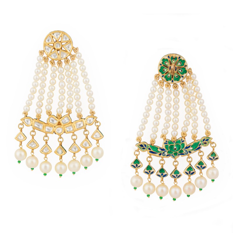 Made in 18 K Gold Gold (18 K) : 17.582 gms Gold wire (18K) : 1.280 gms Diamond Polki : 2.78 carat Pearls (South Sea & Japanese) : 62.94 carat Dimensions (inch): 2.89 (L); 1.57 i(W)