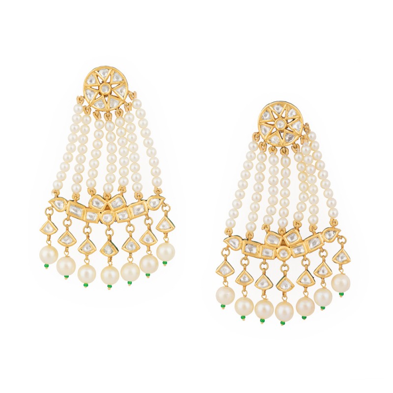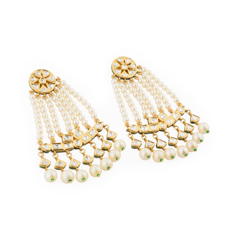 Earring in yellow gold with untreated Syndicate Polki, Emerald and Pearl beads ..