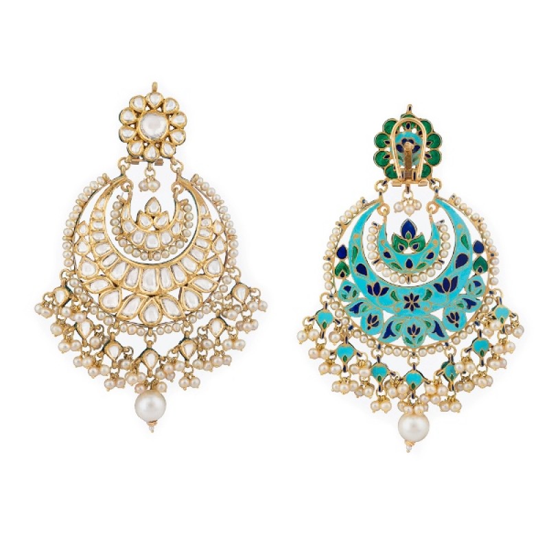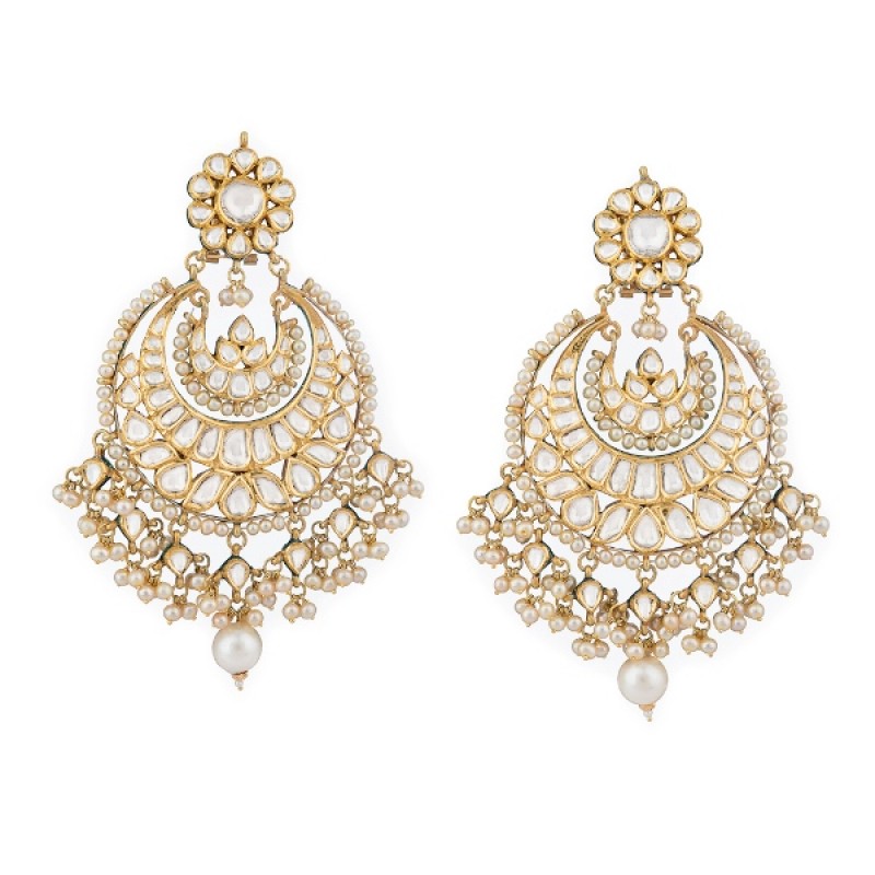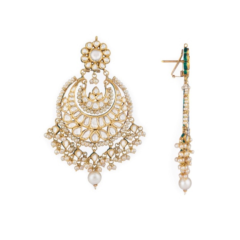 Made in 18 K Gold Gold (18 K) : 49.156 gms Gold wire (18 K) : 4.540 gms Diamond Polki : 7.96 carat Pearl : 34.95 carat Dimensions (inch) : 3.05 (L) ; 1.53 (W)